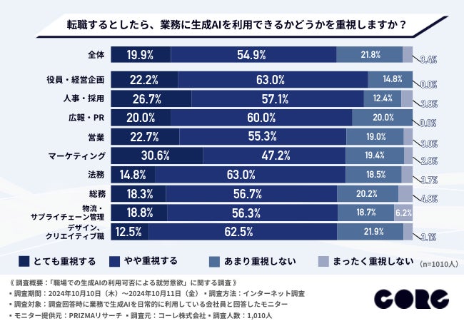 全体では、「とても重視する」「やや重視する」と回答した方を合わせると、約7割の方が転職の際は、業務で生成AIを利用できるかを重視するようです。