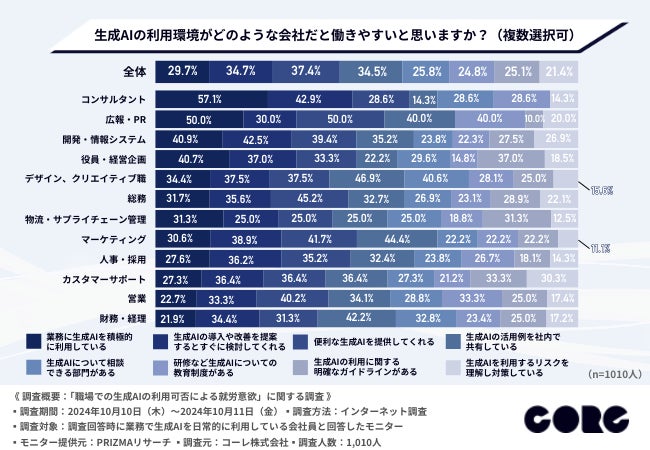 働きやすい環境としては「便利な生成AIを提供してくれる」「生成AI導入や改善を積極的に検討してくれる」「社内で生成AIの活用例を共有している」などの要素が挙げられました。特に「コンサルタント」「広報・PR」職ではAIの積極活用を求める傾向が見られ、生成AIが職場選択に影響する要因となっている様子がうかがえます。