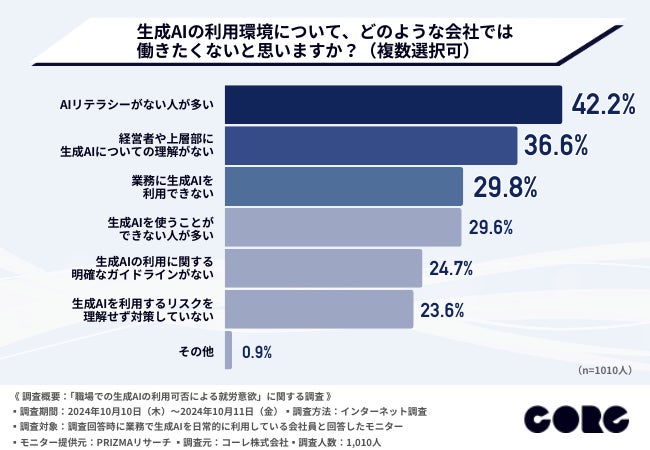 「生成AIの利用環境について、どのような会社では働きたくないと思いますか?(複数選択可)」と質問したところ、『AIリテラシーがない人が多い(42.2%)』と回答した方が最も多く、次いで『経営者や上層部に生成AIについての理解がない(36.6%)』『業務に生成AIを利用できない(29.8%)』となりました。